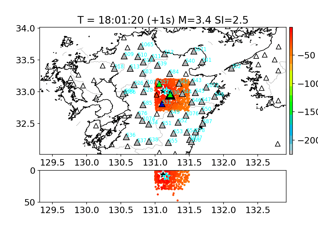 1.地震について (Earthquake Information)-------------------------------------------------------------------   2025/11/25,18:01:16.56 32.998 131.108 9.3 5.8 ------------------------------------------------------------------- Table1. Earthquake information. Origin time, Epicentral latitude, longitude, depth, and JMA magnitude from the left.(ref. JMA catalog) ![]() Fig.1. Event location. 2.観測点分布 (Station Distribution)![]() Fig.2. Station Distribution. 3.緊急地震速報発信状況 (Earthquake Early Warning Report)--------------------------------------------------------------------------------------------   [01] 25/11/25-18:01:16 04 M4.9 33.0N 131.1E 010km (25/11/25-18:01:23)    [02] 25/11/25-18:01:16 5- M5.5 33.0N 131.1E 010km (25/11/25-18:01:25)    [04] 25/11/25-18:01:16 5+ M5.7 33.0N 131.1E 010km (25/11/25-18:01:26)    [05] 25/11/25-18:01:16 5+ M5.7 33.0N 131.1E 010km (25/11/25-18:01:27)    [06] 25/11/25-18:01:16 5+ M5.7 33.0N 131.1E 010km (25/11/25-18:01:29)    [07] 25/11/25-18:01:16 5+ M5.7 33.0N 131.1E 010km (25/11/25-18:01:29)    [09] 25/11/25-18:01:16 5+ M5.6 33.0N 131.1E 010km (25/11/25-18:01:31)    [10] 25/11/25-18:01:16 5+ M5.7 33.0N 131.1E 010km (25/11/25-18:01:32)    [11] 25/11/25-18:01:16 5+ M5.6 33.0N 131.1E 010km (25/11/25-18:01:39)    [12] 25/11/25-18:01:16 5+ M5.7 33.0N 131.1E 010km (25/11/25-18:01:41)    [13] 25/11/25-18:01:16 5+ M5.7 33.0N 131.1E 010km (25/11/25-18:01:49)    [15] 25/11/25-18:01:16 5+ M5.7 33.0N 131.1E 010km (25/11/25-18:02:09)    --------------------------------------------------------------------------------------------- (左から順に情報番号,震源時,最大予測震度,マグニチュード, 震央緯度,震央経度,震源深さ,電文発表時刻) from CEORKA --------------------------------------------------------------------------------------------- Table2. Earthquake early warning reports. Information ID, Origin time, Maximum Intensity, JMA magnitude, Epicentral latitude, longitude, depth, and time to issue the report from the left.(ref. The Committee of Earthquake Observation and Research in the Kansai Area) 気象庁による緊急地震速報の内容: 予報・ 警報 4.観測記録 (Observed Records)